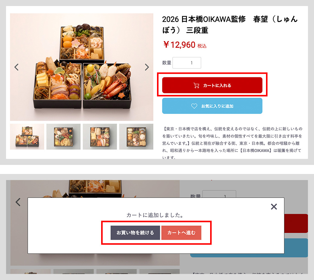 商品詳細から「商品」「数量」をご選択の上、「カートに入れる」ボタンを押してください。