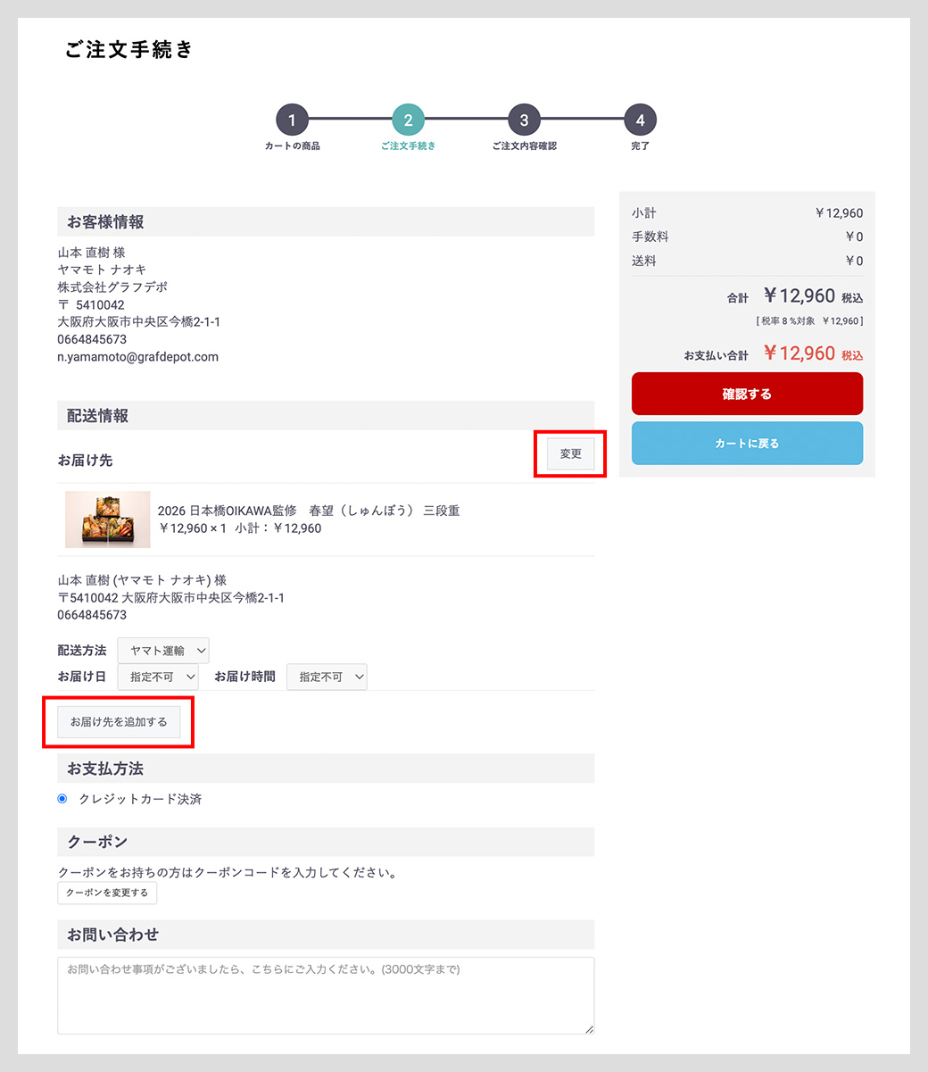 お届け先の住所をご確認ください。変更する場合は「変更」ボタンを押してください。お届け先を追加することも可能です。