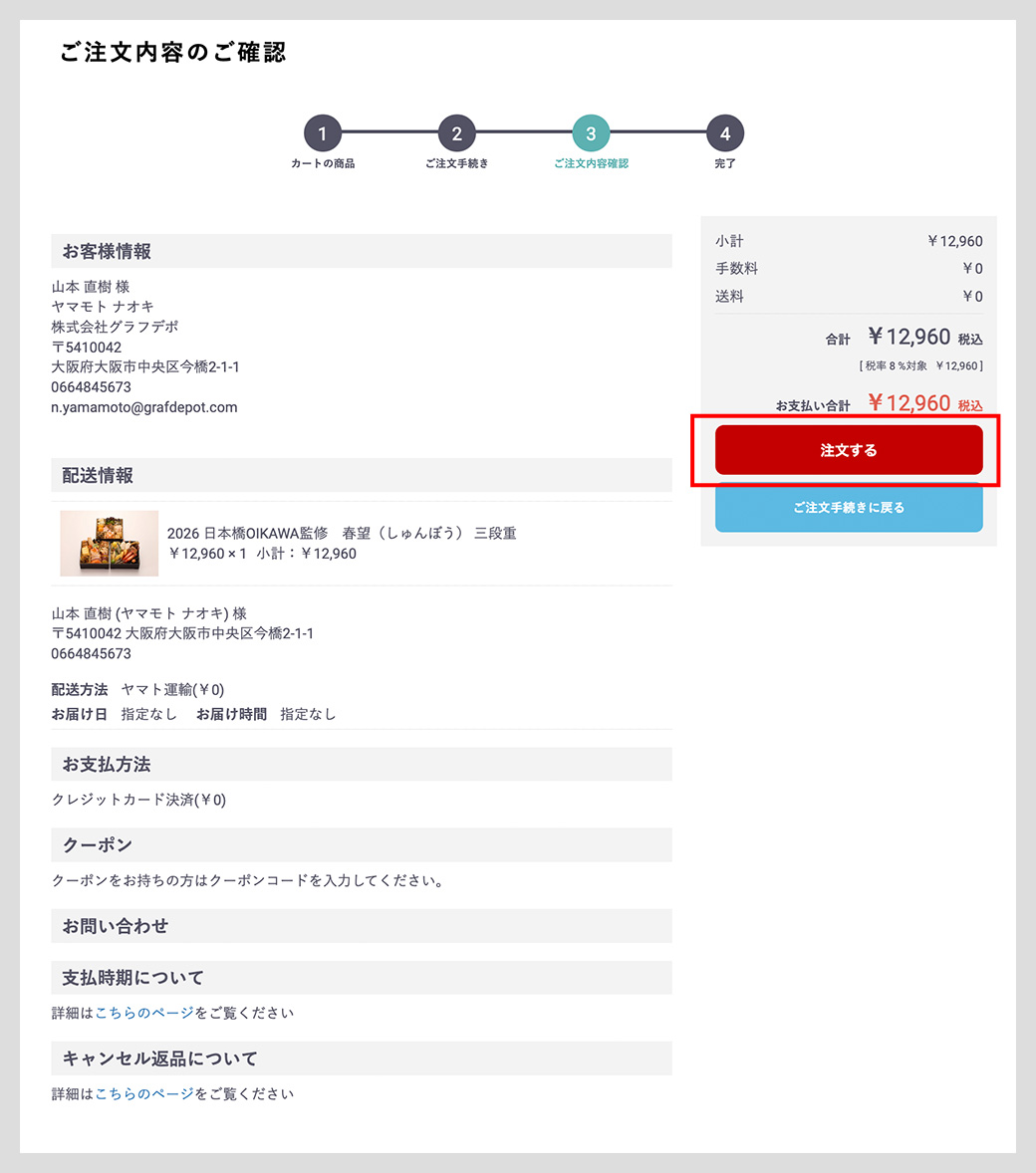 ご注文内容をご確認いただき「注文する」ボタンを押してください。