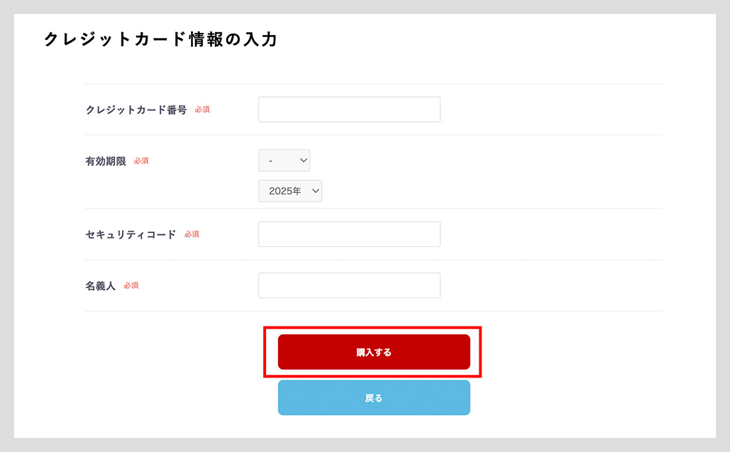 カード情報をご入力いただき「購入する」ボタンを押してください。ご注文完了となります。ご登録いただいたメールアドレスへ確認メールをお送りいたしますので、ご確認ください。会員のお客様は、マイページの「ご注文履歴」よりご注文内容をご確認いただけます。