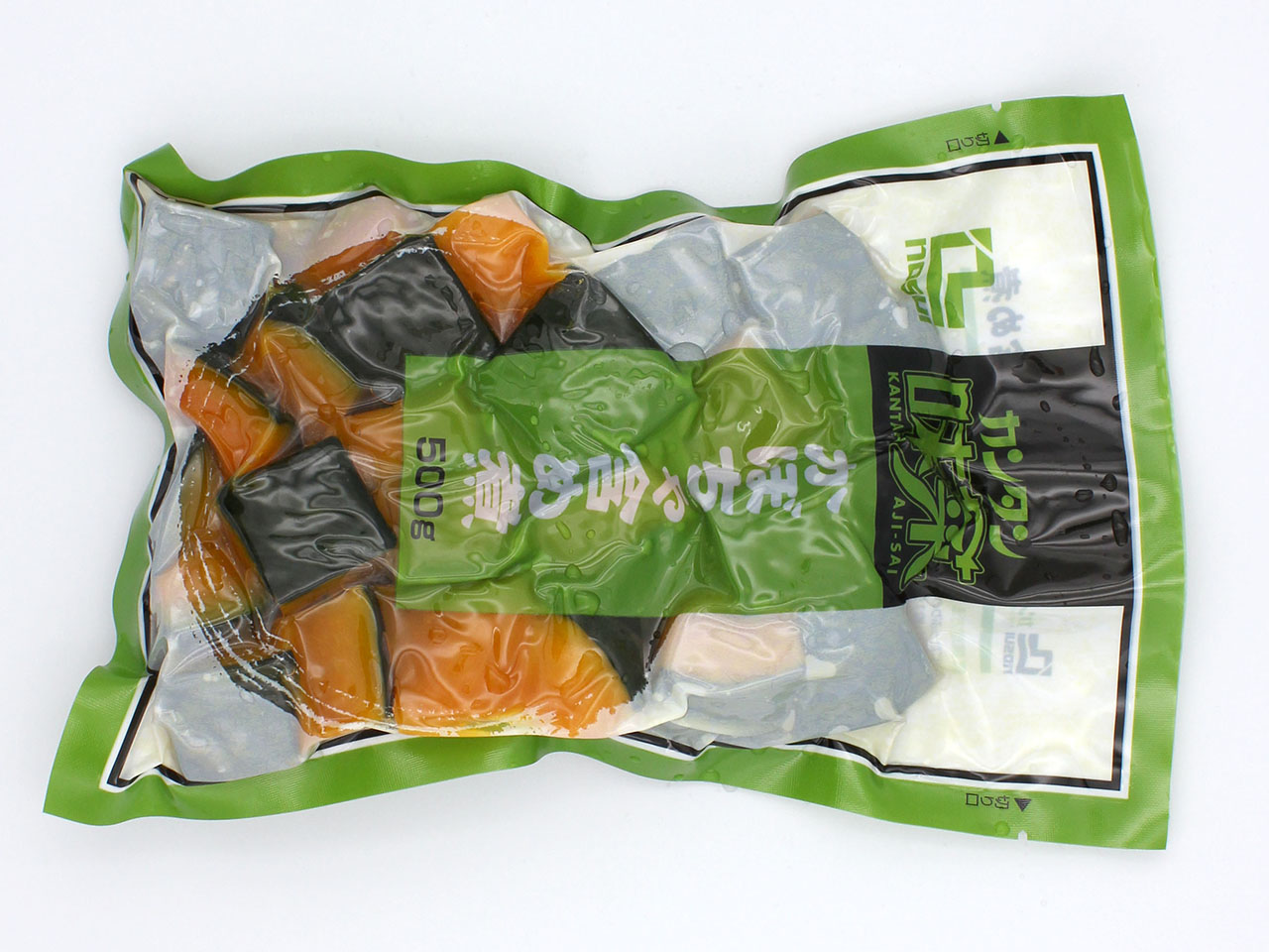 簡単調理、ほっこり種を使用したかぼちゃの含め煮です。鍋にたっぷりのお湯を沸かし、凍ったままの「かぼちゃ含め煮」を袋のまま入れ、約15分間温めた後、流水で約15分間冷却してください。
